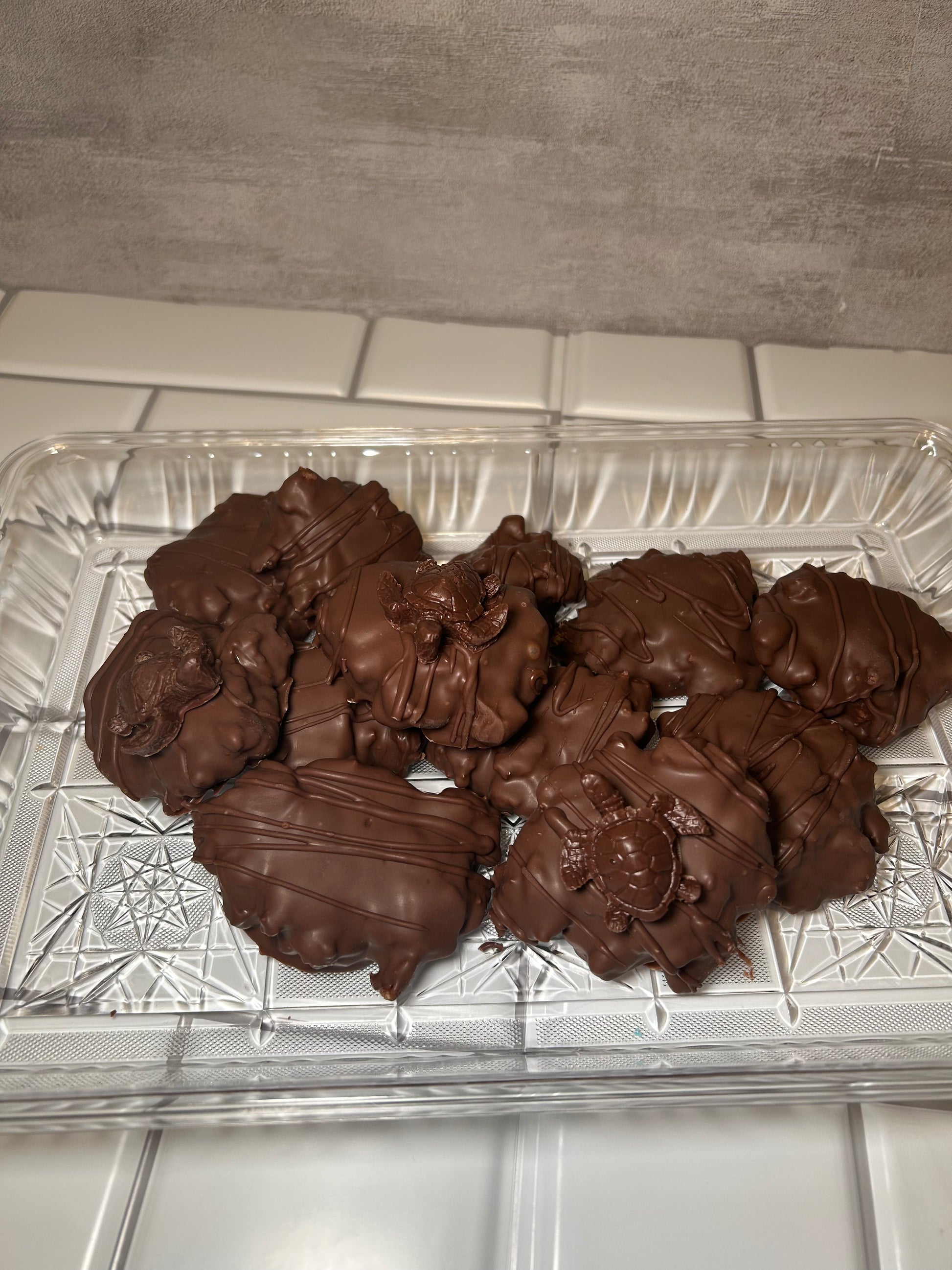 Each bite of these handcrafted candy turtles delivers the perfect balance of creamy, crunchy, and chocolatey goodness. Made with layers of buttery caramel and roasted pecans, then dipped in smooth, rich chocolate, they’re a true indulgence that melts in your mouth. Finished with a drizzle of chocolate for that signature homemade touch, these sweet clusters are pure comfort in every bite — the kind of treat that keeps you coming back for “just one more.”